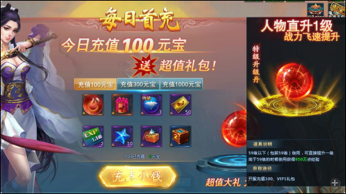 2) 每日首充:参与开服前7日中的每日充值,每日可领取“59级升级丹”一个,可是玩家直接由58级升至59级;