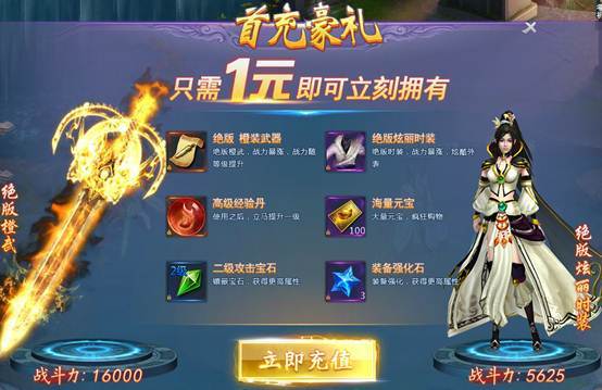 1) 开服首充:参与开服首充,立即获得“54级升级丹”一个,可使玩家直接由54级提升至55;