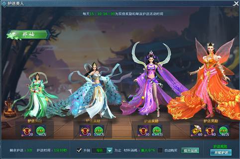 二、每位玩家每天可参与3次护送,所护送的美人分成4种品质,使用美人令有概率提升美人品质,品质越高,护送完毕后获得的奖励越高。