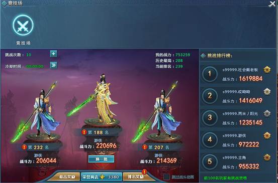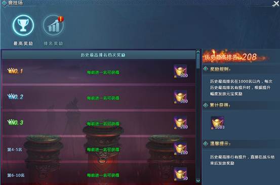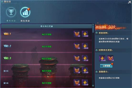 排名奖励:奖励包括荣誉值、竞技勋章、绑定元宝,角色排名越高,奖励越丰厚;排名奖励每日0点根据昨日排名进行结算,玩家需要自己在排名奖励界面手动领取每日奖励。