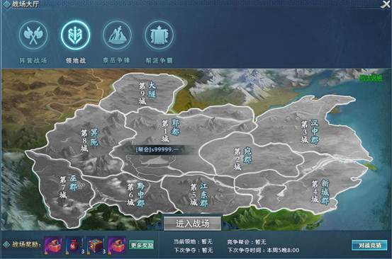 2)“领地战”前一天“帮会争霸”积分排名前9的帮会,获得参战资格;